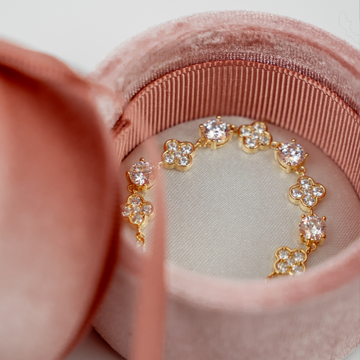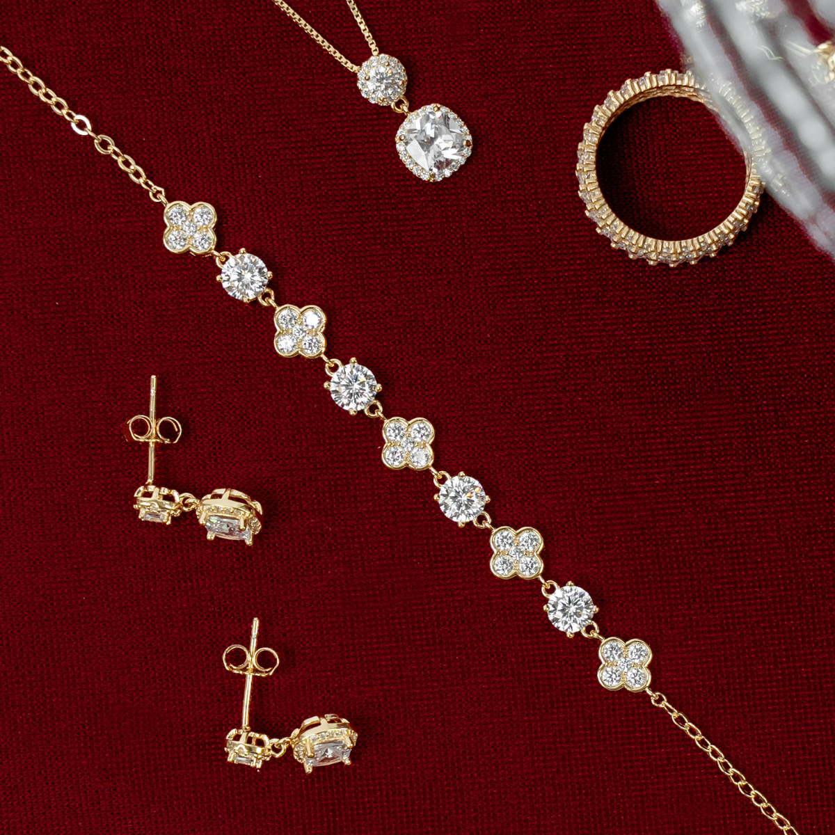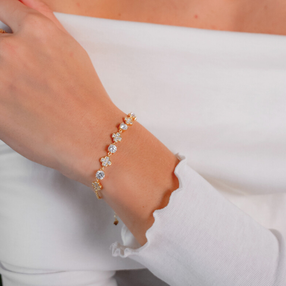 Naprzemienne połączenie okrągłych kamieni i subtelnych czterolistnych form tworzy efekt biżuterii z wyższej półki — harmonijnej, starannie zaprojektowanej i pełnej spektakularnego blasku.