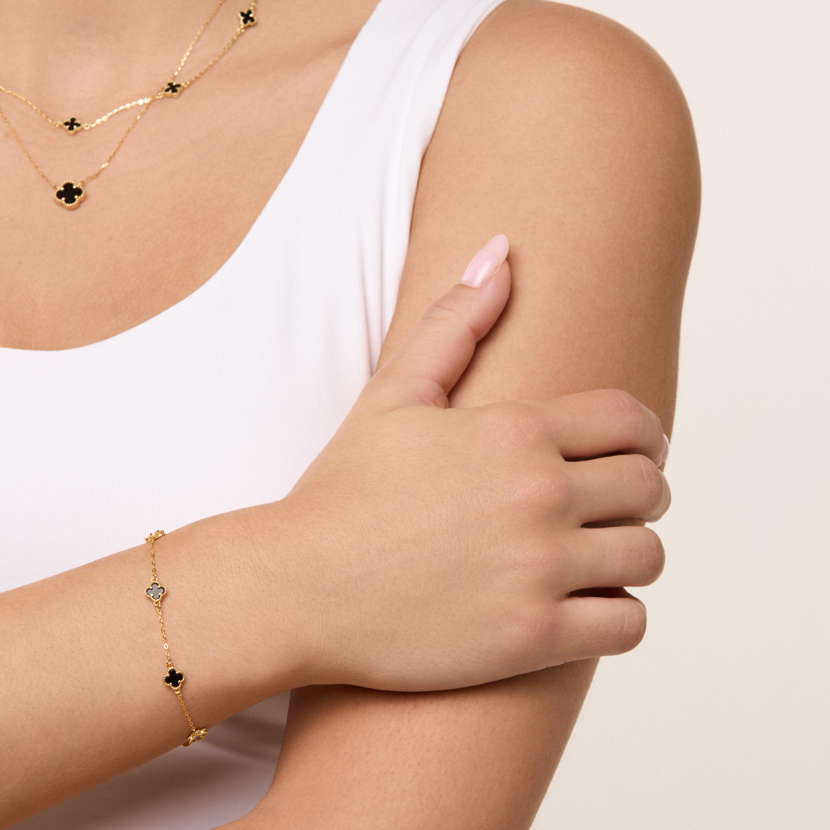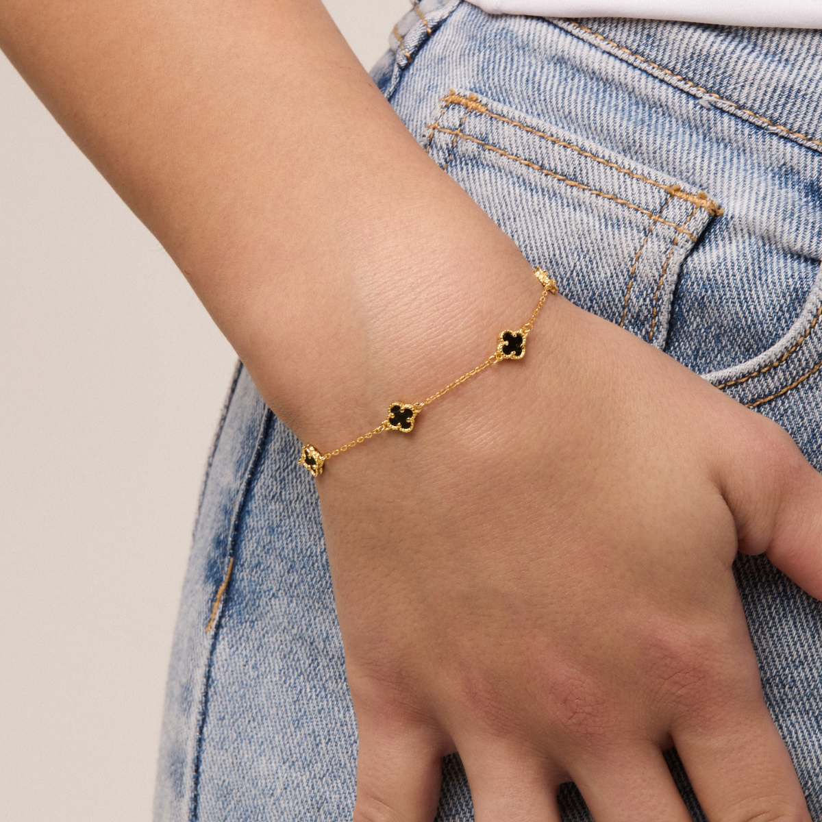 Odkryj biżuterię, która łączy głębię czerni, symbolikę szczęścia i ponadczasowy styl. Maroko Black to srebrna pozłacana bransoletka, której pięć drobnych koniczynek z naturalnym onyksem tworzy wyjątkową kompozycję – subtelną, ale pełną charakteru.