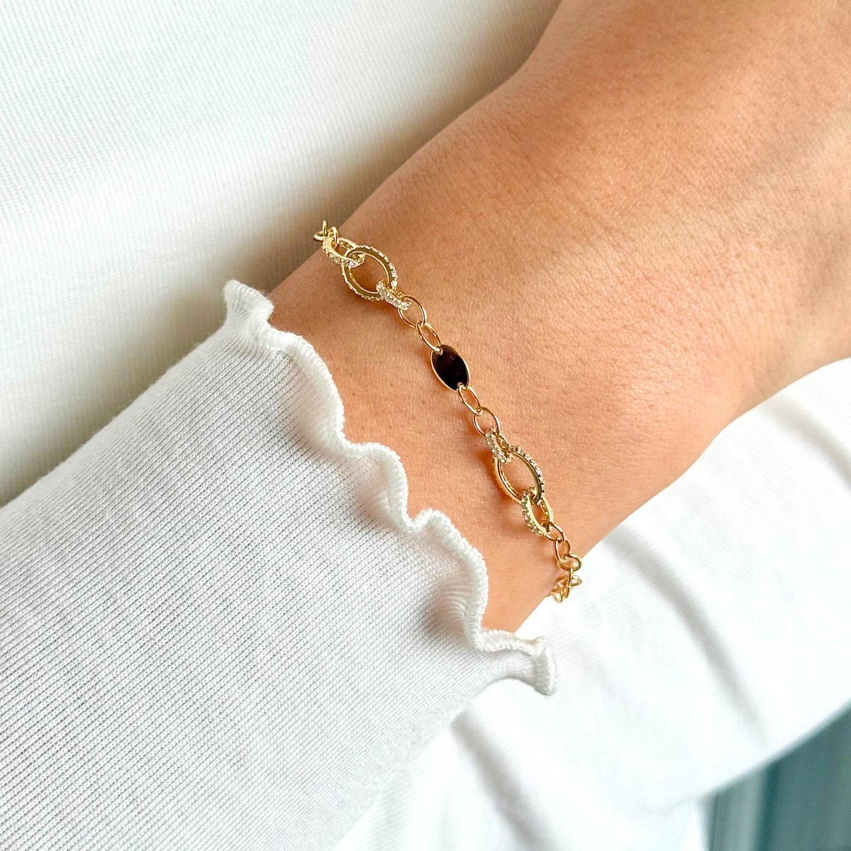 To właśnie ten kontrast – gładkiego złota i błyszczących elementów – sprawia, że bransoletka mieni się z klasą, dodając całości elegancji i szyku.