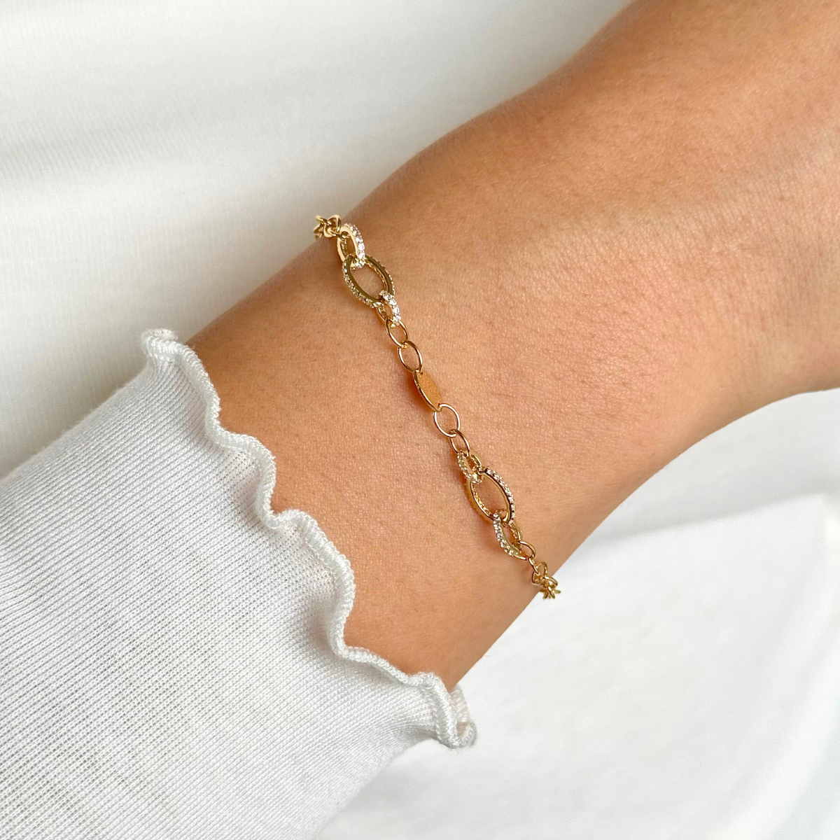 Każde ogniwo bransoletki zostało dopracowane w najmniejszym detalu – część z nich ozdobiono drobniutkimi cyrkoniami, które subtelnie połyskują przy każdym ruchu dłoni.