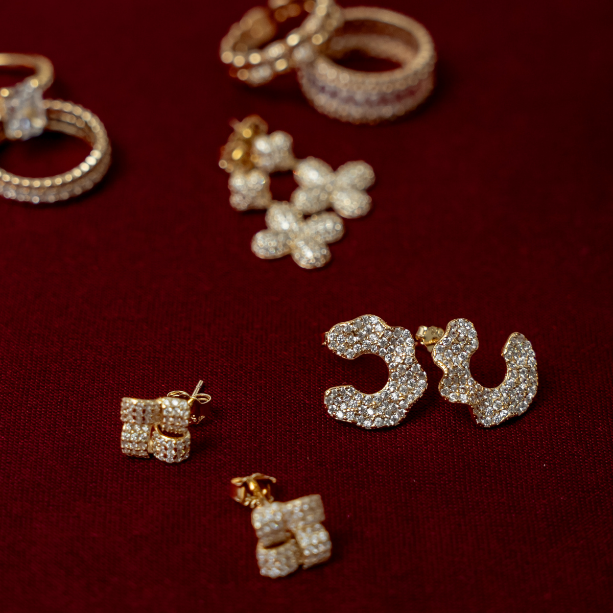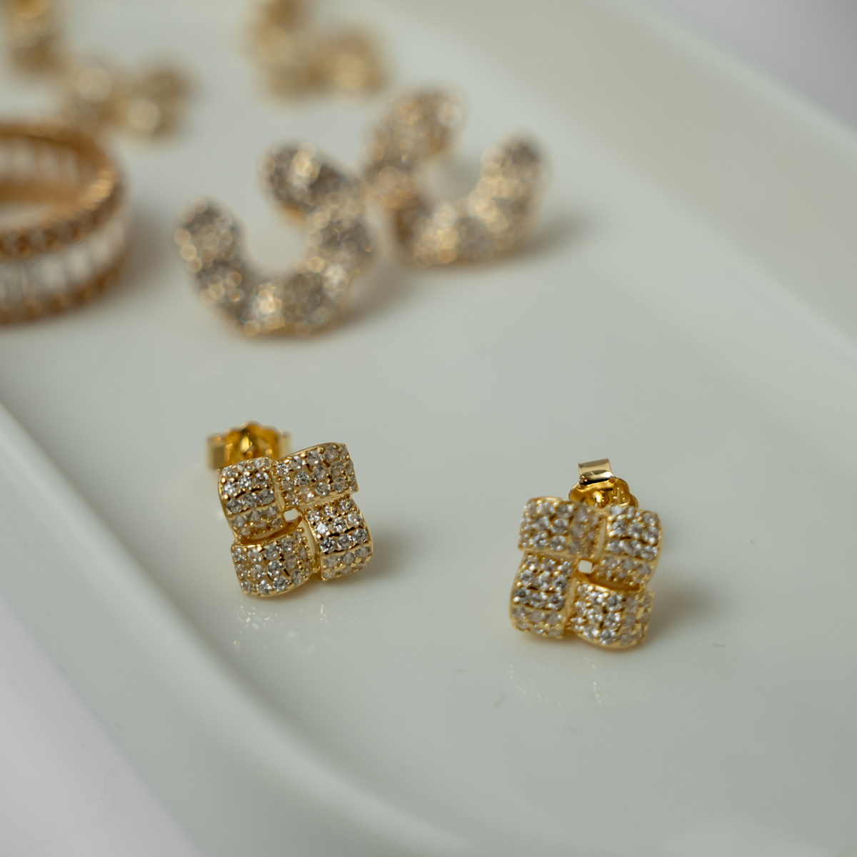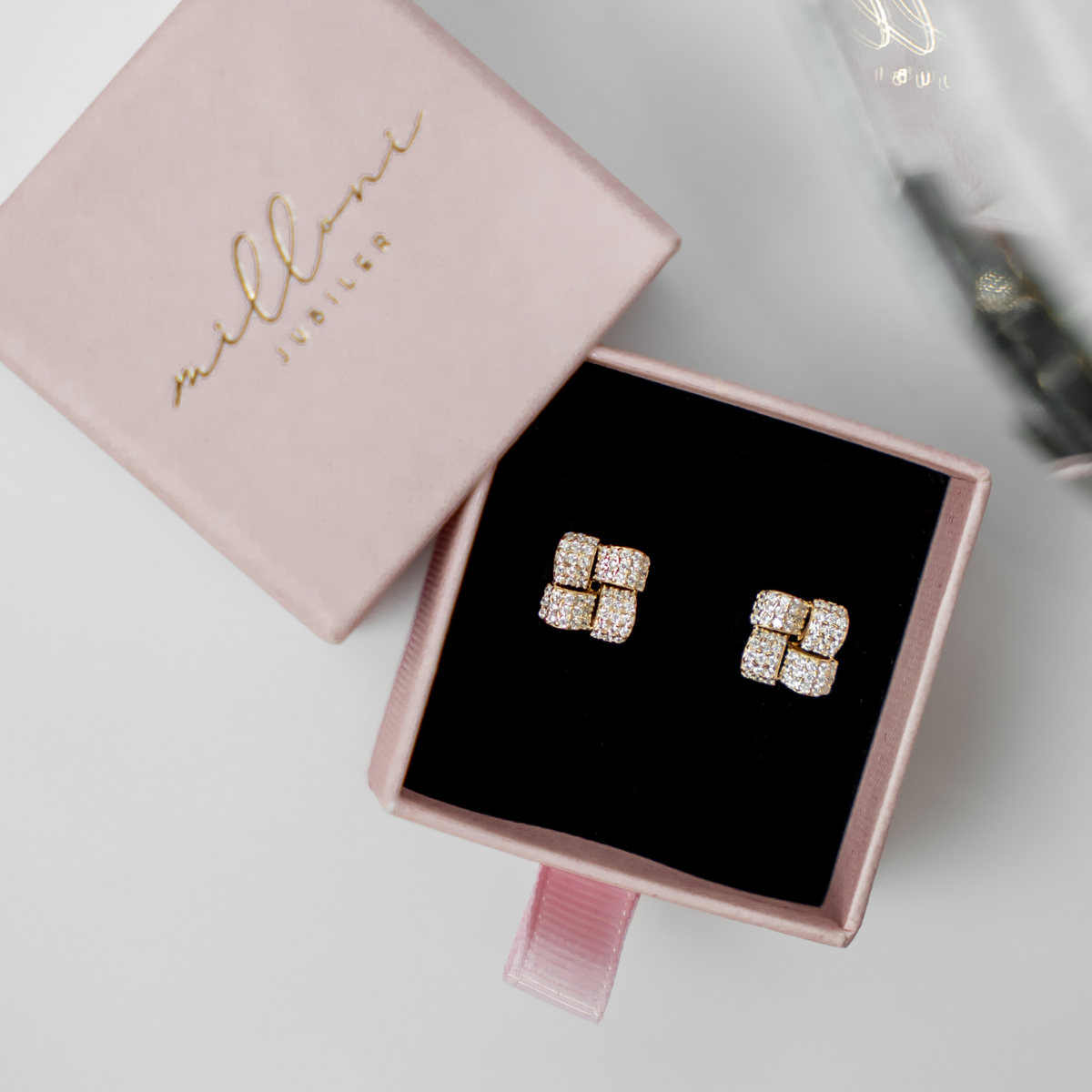 Kolczyki Elleore zostały wykonane ze srebra próby 925, pokrytego warstwą ciepłego, szlachetnego złota. Ich design przypomina delikatne, zaokrąglone poduszeczki, wysadzane drobniutkimi, misternie osadzonymi cyrkoniami. Każdy kamień odbija światło pod innym kątem, co tworzy efekt prawdziwego glamour — widoczny nawet z daleka.