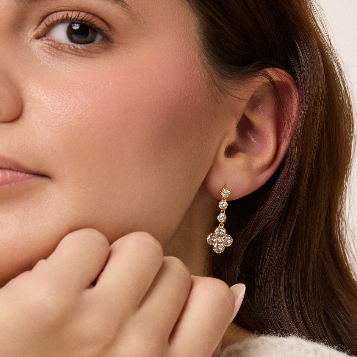 Blask cyrkonii jest wyjątkowy – ich rozmiar i jakość sprawiają, że Leora iskrzy przy każdym ruchu głowy. To kolczyki stworzone z myślą o kobietach, które uwielbiają błyszczeć… ale z klasą.