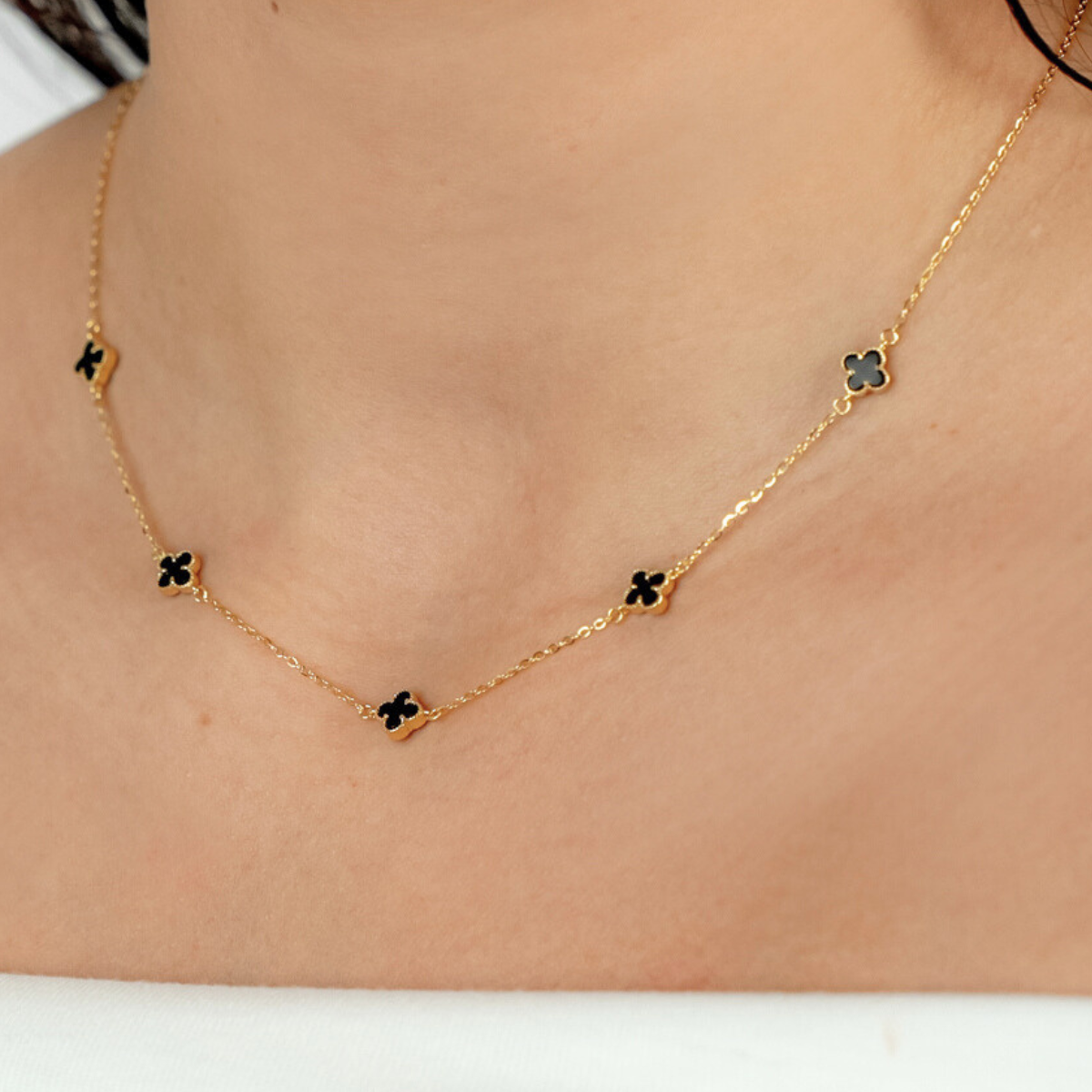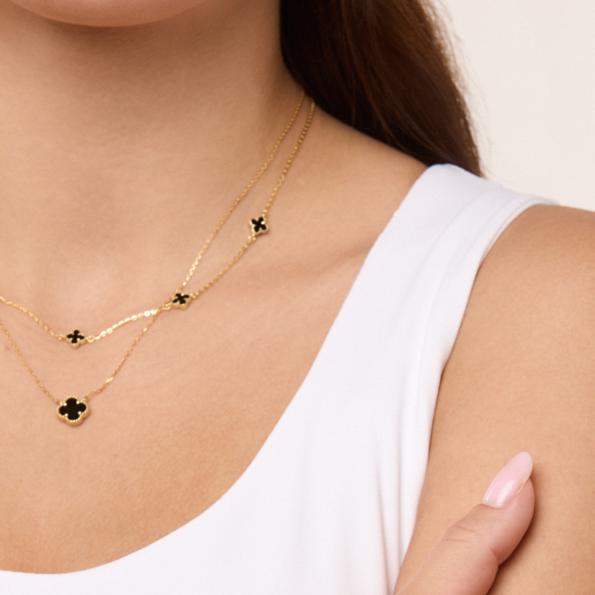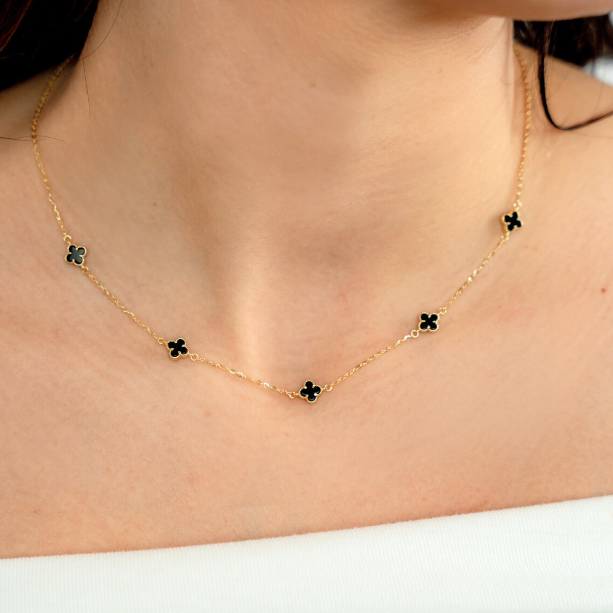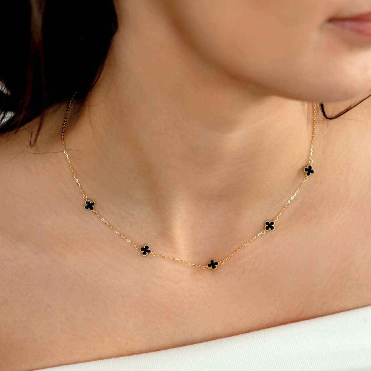 Naszyjnik Maroko Black to srebrny pozłacany model ozdobiony pięcioma drobnymi koniczynkami marokańskimi z czarnym onyksem – kamieniem kojarzonym z siłą, ochroną i pewnością siebie.